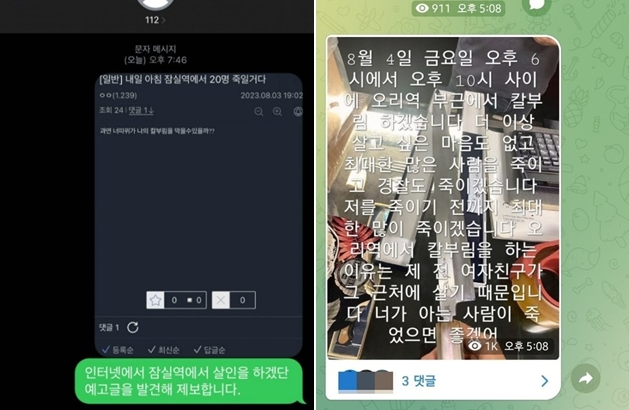 온라인 커뮤니티 디시인사이드에는 이날 오후 7시2분쯤 ‘내일(4일) 아침 잠실역에서 20명 줄일 거다’라는 제목의 글이 올라왔고 글쓴이는 “과연 너 따위가 나의 칼부림을 막을 수 있을까”라고 적기도 했습니다.
