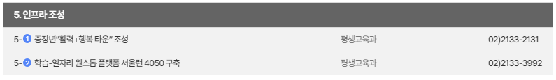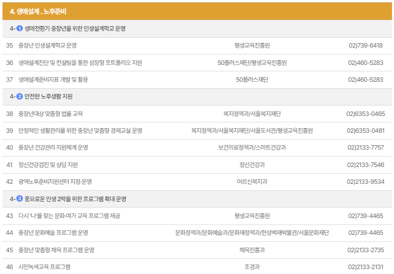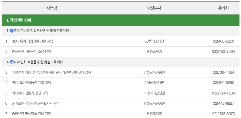 - 직업 역량 교육 : 미네르바형 직업전환 지원체계, 대학연계 진로 직업교육, 중장년층 직업훈련 장학금 지원