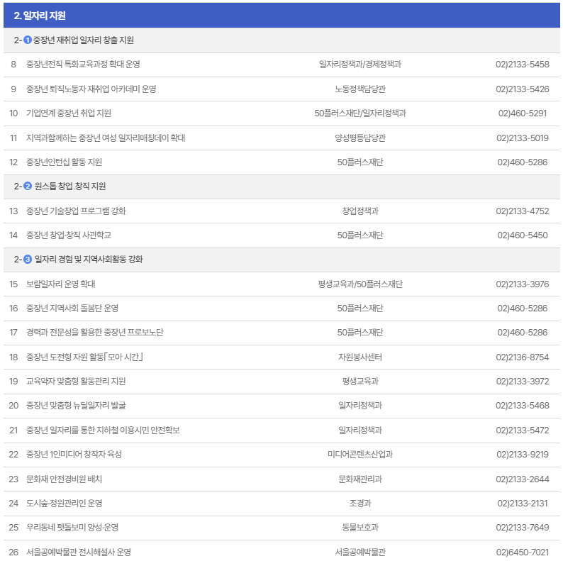 - 일자리 지원 사업 : 재취업(이직, 전직) 지원, 창업 창직지원, 보람 일자리, 안심/뉴딜일자리