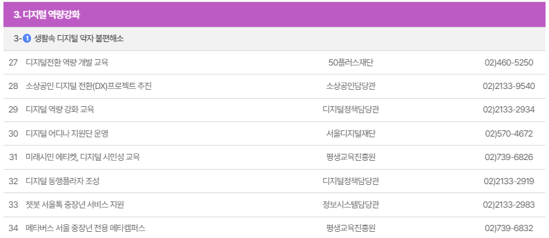 - 디지털 전환 교육 : 미래사회 직업능력 교육, 소상공인 디지털 전환 교육, 디지털 역량강화 운동