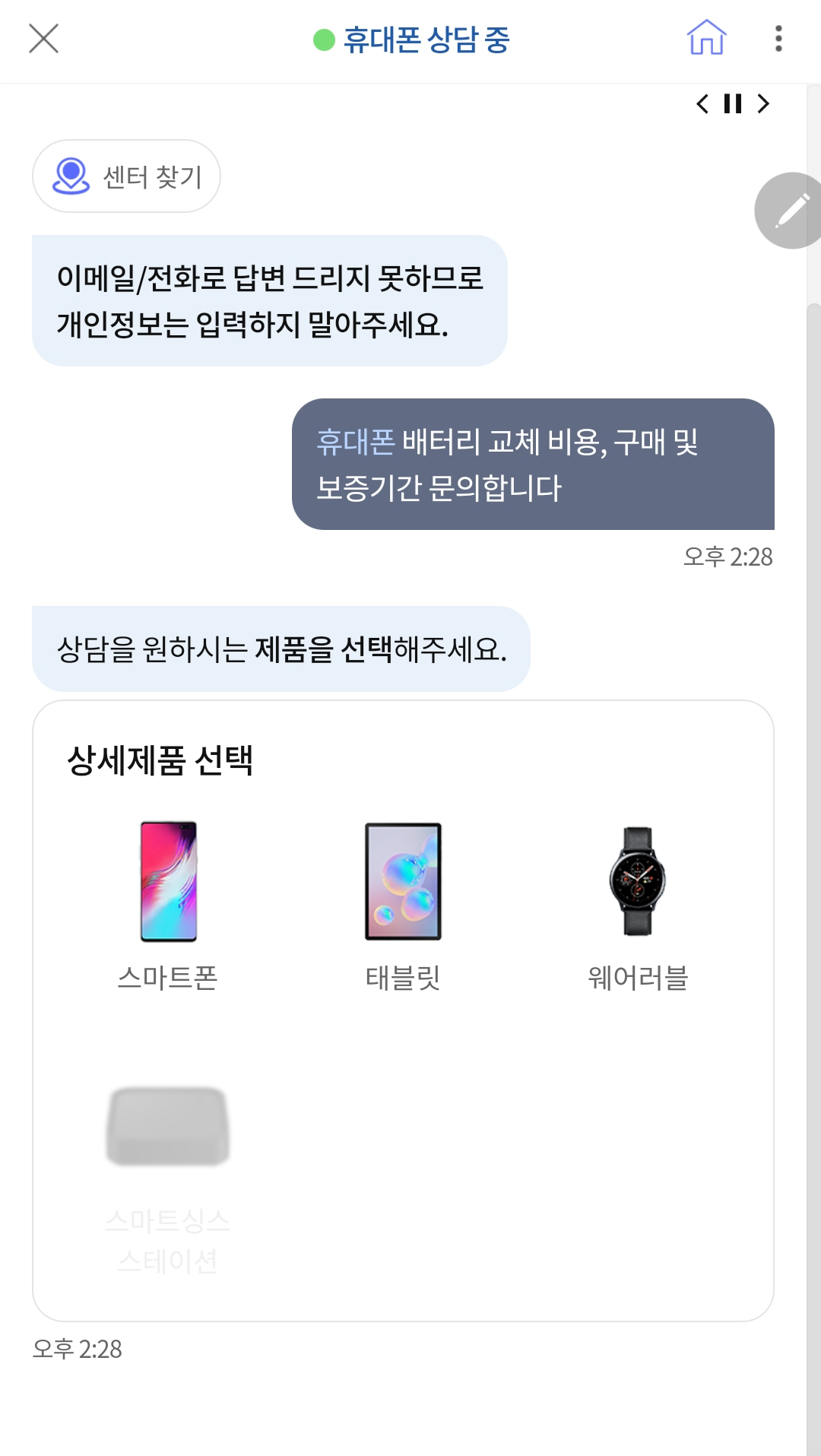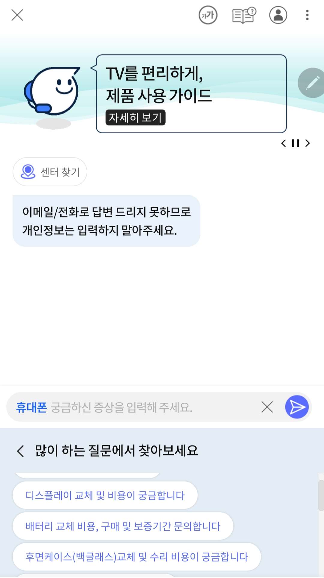 삼성전자서비스챗봇이 여러가지 궁금한 내용을 손쉽게 알려주거든요.