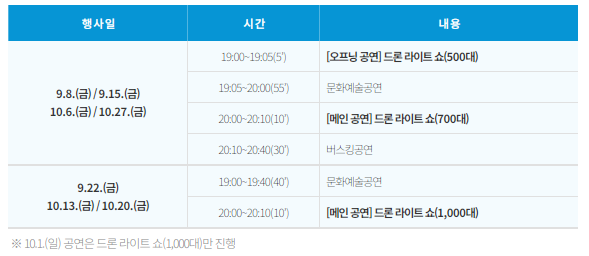 배터리의 한계로 10여 분의 짧은 공연을 제공할 수밖에 없는 드론 라이트 쇼의 아쉬움을 해소하고자, 저녁 7시부터 약 한 시간 동안 사전 문화예술공연이 더해졌습니다. 다만, 10월 1일에는 사전 문화예술공연 없이 본 공연인 드론 라이트 쇼만 진행될 예정입니다.
